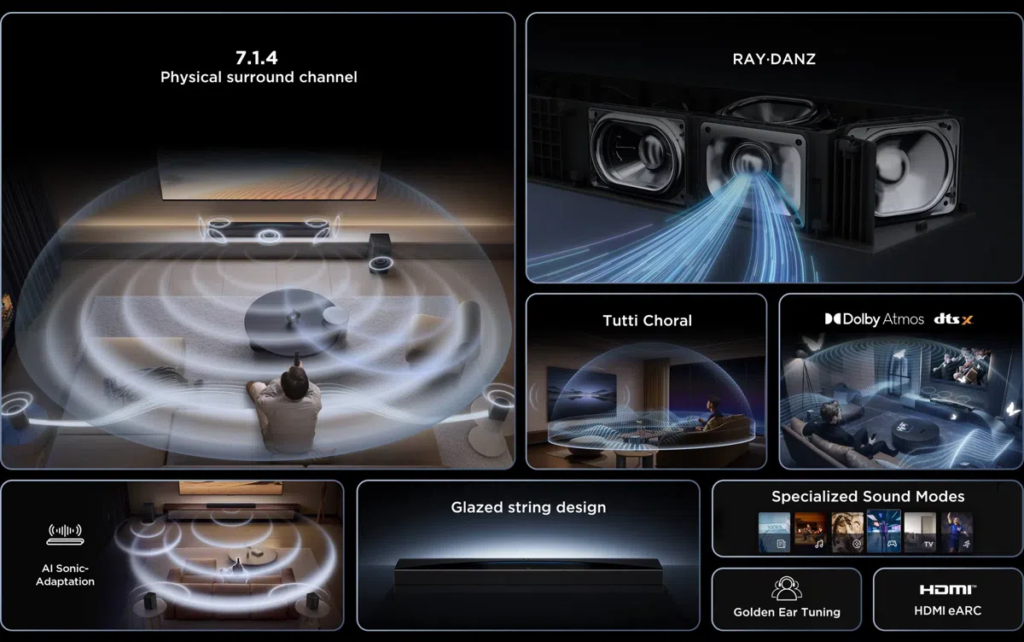 | Audio Channels | 7.1.4 true surround sound with 12-channel hardware & 15 speakers |
